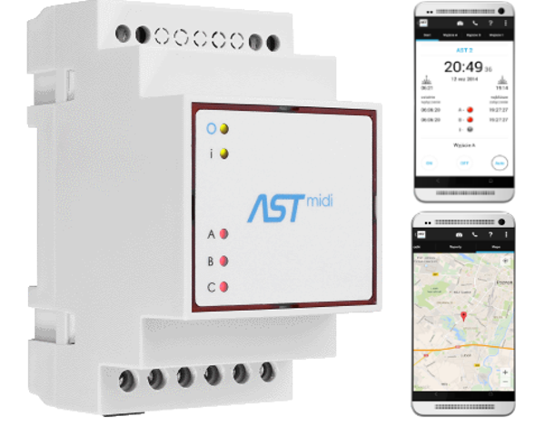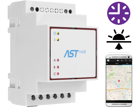 ASTmidi - Sterownik oświetlenia ulicznego. ASTmidi posiada w zależności od opcji 2 lub 3 niezależnie działające wyjścia, wejście fotokomórka/kaskada i wbudowany Bluetooth. ASTmidi, na podstawie pozycji GPS, sam wyliczy optymalny czas sterowania oświetleniem. Każdy sterownik z linii AST został wyposażony w precyzyjny zegar czasu rzeczywistego oraz możliwość synchronizacji czasu z ustawieniami GPS telefonu, dzięki czemu oświetlenie załączane jest precyzyjnie, co przekłada się na oszczędności w kosztach oświetlenia. Sterowniki AST dają możliwość precyzyjnego dostosowania czasu pracy oświetlenia w zależności od pory roku. Sterowniki serii AST są pierwszymi na rynku które umożliwiają wprowadzanie korekt czasu załączenia/wyłączenia dla poszczególnych miesięcy.